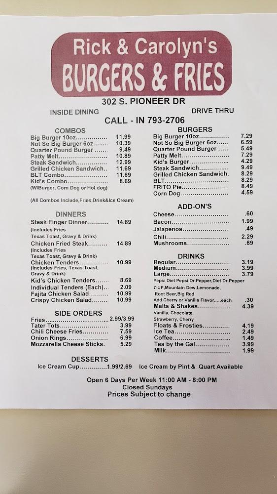 Welcome to Rick & Carolyn's Burgers & Fries, your go-to spot in Abilene, TX, for mouthwatering burgers and delightful fries. Located at 302 S Pioneer Dr, we offer a casual and welcoming atmosphere perfect for solo diners, families, and groups alike. Enjoy a range of delicious American cuisine, including local specialties, with options for dine-in, takeout, and delivery. Our menu includes kid-friendly choices and shareable portions, complemented by an impressive selection of teas. With accessible seating and parking, we're committed to serving everyone. Visit us for a quick lunch or a hearty dinner—great food awaits!